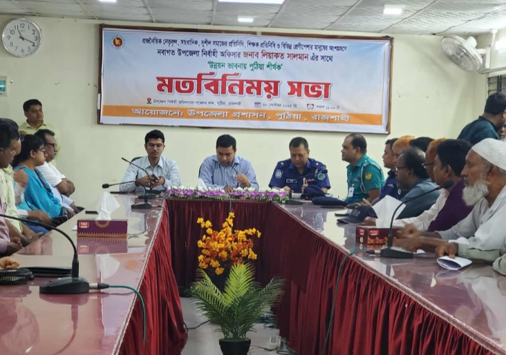 রাজশাহীর পুঠিয়ায় নবাগত উপজেলা নির্বাহী অফিসার এর উন্নয়ন ভাবনায় পুঠিয়া শির্ষক মতবিনিময় সভা অনুষ্ঠিত হয়েছে। মঙ্গলবার (৩০ সেপ্টেম্বর) সকল ১১ টায় উপজেলা নির্বাহী অফিসারের সভা কক্ষে এ মতবিনিময় সভাটি অনুষ্ঠিত হয়। উক্ত অনুষ্ঠানে নবাগত উপজেলা নির্বাহী অফিসার লিয়াকত সালমান এর সভাপতিত্বে উপস্থিত ছিলেন উপজেলা সহকারী কমিশনার (ভূমি) শিবু দাস,পুঠিয়া থানা অফিসার ইনচার্জ কবির হোসেন,বেলপুকুর থানার অফিসার ইনচার্জ সুমন কাদেরী, সাবেক উপজেলা চেয়ারম্যান অধ্যাপক নজরুল ইসলাম মন্ডল,পুঠিয়া উপজেলা বিএনপি আহবায়ক ও কেন্দ্রীয় নেতা আবু বক্কর সিদ্দিক, কৃষক দলের সাবেক সভাপতি রোকনউজ্জাম আলম, সাবেক মেয়র আল মামুন খান,,সাবেক যুবদলের কেন্দ্রীয় কোষাধ্যক্ষ গোলাম মোস্তফা, রাজশাহী জেলা যুব দলের সাবেক সাংগঠনিক সম্পাদক জুলফিকার আহমেদ ভুট্টাে, জামাতের পুঠিয়া উপজেলা নায়েবে আমির ইউসুফ আলী, উপজেলা জামাতের সাধারণ সম্পাদক এ এইচ এম মুনরুল হক এছাড়াও উক্ত মতবিনিময় ছিলেন উপজেলার বিভিন্ন দপ্তরের অফিসার গন, সাংবাদিক গন,সুশীল সমাজ, শিক্ষক প্রতিনিধী, বিভিন্ন শ্রেনীর পেশাজীবি মানুষ গন উপস্থিত ছিলেন।