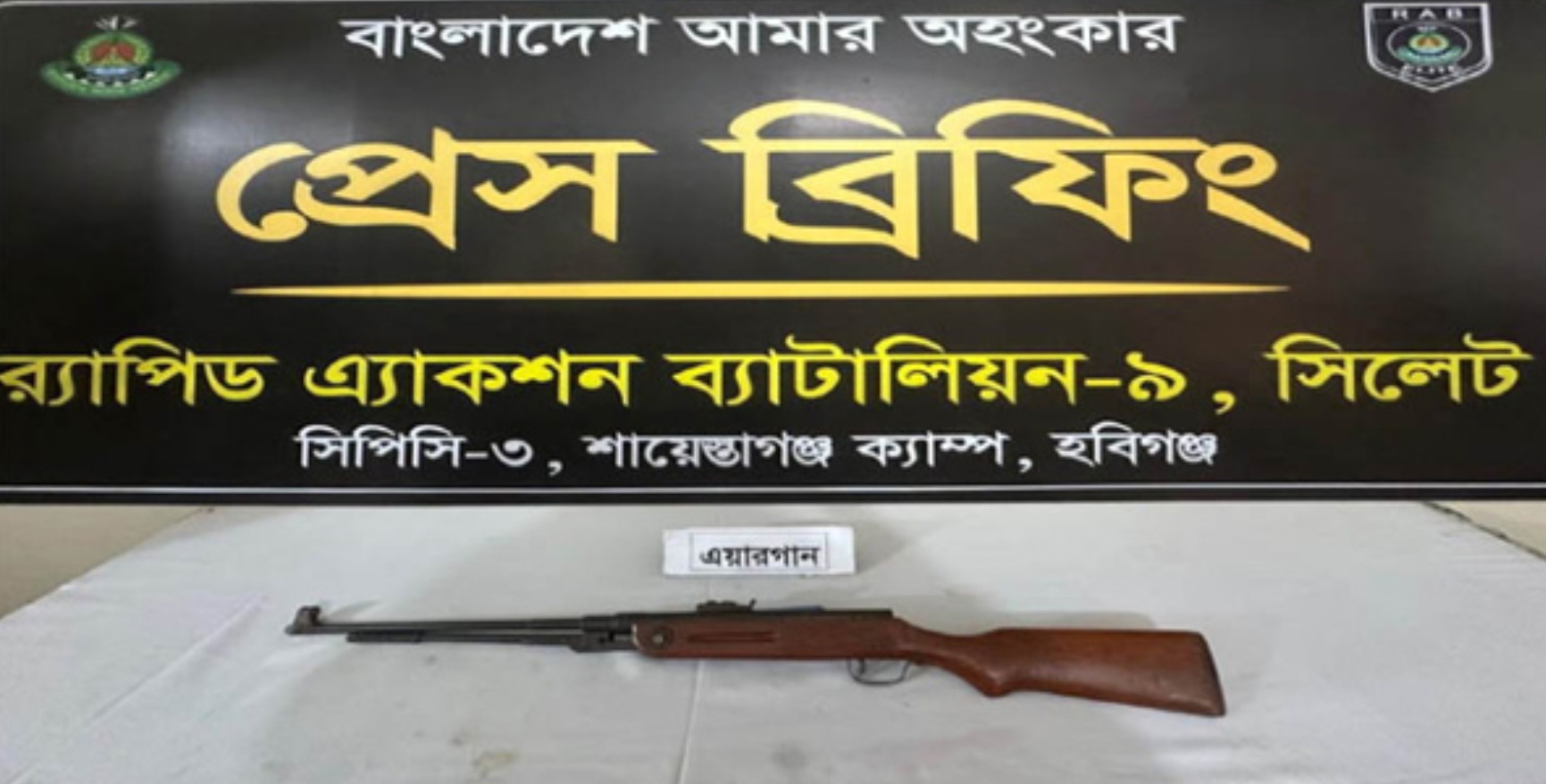 র্যাব জানায়, শুক্রবার দিবাগত রাত আনুমানিক ২টার দিকে হবিগঞ্জ জেলার শায়েস্তাগঞ্জ থানাধীন নুরপুর ইউনিয়নের সুতাং বাজার এলাকা থেকে প্লাস্টিকের বস্তায় মোড়ানো অবস্থায় এয়ারগানটি উদ্ধার করা হয়,।